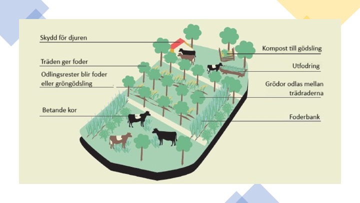 Projektet lägger ett särskilt fokus vid agroforestry, odlingssystem där traditionella jordbruksgrödor och/eller djurhållning kombineras med produktiva träd eller andra vedartade perenner. Komponenterna i ett agroforestrysystem kan kombineras i allt från enkla system, (t.ex. träd som vindskydd för åkergrödor), till komplexa system med en mångfald av arter från djur och växtriket, se illustration nedan.